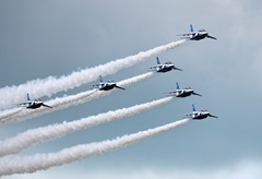 入場後、機材のセットアップを行ってから展示飛行を待つことにした。今年は開催日前日までに発生した能登半島の大雨被害に配慮して展示内容を変更するとのアナウンスがあったけれど、具体的な変更内容は不明だったので、災害派遣を優先して救難展示がなくなる程度かなと思っていた。最初の展示飛行は303飛行隊の展示飛行で、これまでであれば機動飛行が行われていた記憶があったけれど、航過飛行であっさりと展示飛行が終了。続いて行われた306飛行隊の展示飛行も同様に航過飛行であった。さらに続いてブルーインパルスの飛行展示も行われたけれど、こちらも機動飛行要素はなくいくつかのパターンによる航過飛行で終了。午前中は次第に腫れてきたのだけれど、ブルーインパルスの飛行展示の時間帯にはまた雨が降って雲が多くなってしまった。また、風が強くてスモークもすぐに流されたので、どちらかというと残念な感じであった。