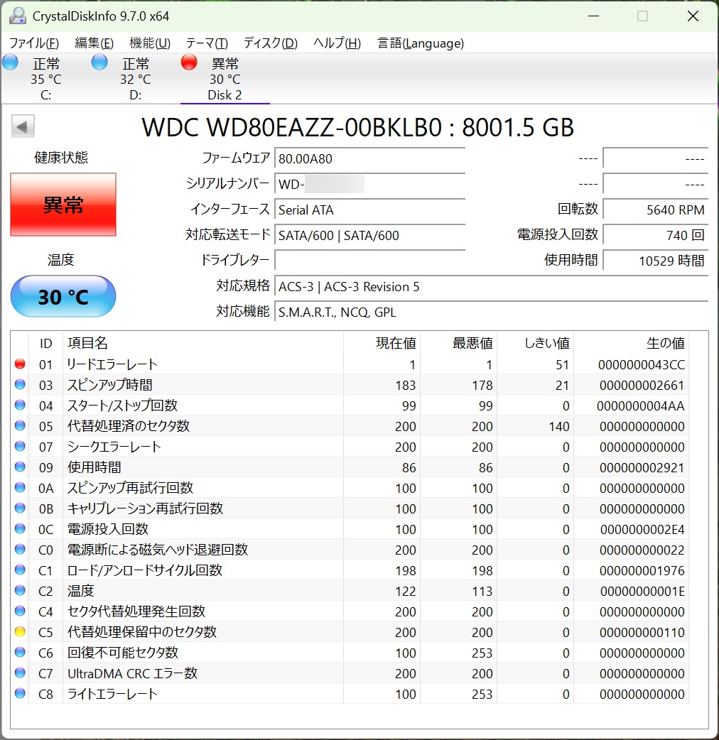 ドライブレコーダーの録画データ置き場にしていたHDDはWD80EAZZ-00BKLB0で、このHDDについてCrystalDiskInfoを用いてS.M.A.R.T.情報を確認してみたところ、代替処理保留中セクタのカウントが30個以上となっていて「注意」状態と判定されていた。予備HDDとして使用時間がさほど長くないWD80EAZZ-00BKLB0がもう一台あったので、一旦、こちらに全ての内容をコピーすることにした。ほとんどのファイルのコピーは問題なく成功したものの、一部のフォルダが壊れていてアクセスできなくなっていたので、一旦CHKDSKで修復を実行。CHKDSKは問題なく完了して壊れていたフォルダにもアクセスできるようになり、コピーできていなかったデータもコピーに成功。