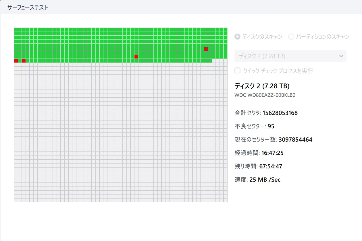 エラーが出ていたWD80EAZZ-00BKLB0の内容の待避に成功したので、このHDDを作業用PCであるSaoriに接続し、SaoriのLinux環境にてshredにより全領域抹消を実行。抹消完了後、代替処理保留中セクタのカウントは一旦0になったので、念のためと考えてWD Data LifeGurard DiagnosticsにてEXTENDED TESTを実行したところ、不良セクタが多数検出されたたとの表示が出てテストに失敗してしまった。また、代替処理保留中セクタのカウントは再び増加。 テスト失敗表示のダイアログにRepairボタンがあったのでRepairを実行してみたところ、代替処理保留中セクタのカウントがいくらか減少したものの0にはならなかった。もう一度、EXTENDED TESTを実行したところ、今回も不良セクタ多数検出のためテストに失敗してしまった。今回はRepairボタンは表示されず、代替処理保留中セクタのカウントはさらに増加。ここで、 WD Data LifeGurard DiagnosticsでのテストではなくEaseUS Partition Masterのサーフェイステストを行ってみたところ、正常時よりテストの進行がかなり遅く、残り時間の表示がかなりの時間(67時間以上)となっていたため、途中でテストを中断。この時点で代替処理保留中セクタのカウントがさらに増えただけではなくリードエラーレートもかなり悪化し、CrystalDiskInfoでの状態表示も「注意」から「異常」に変化。まさかここまで状態が悪化するとは予想していなかった。