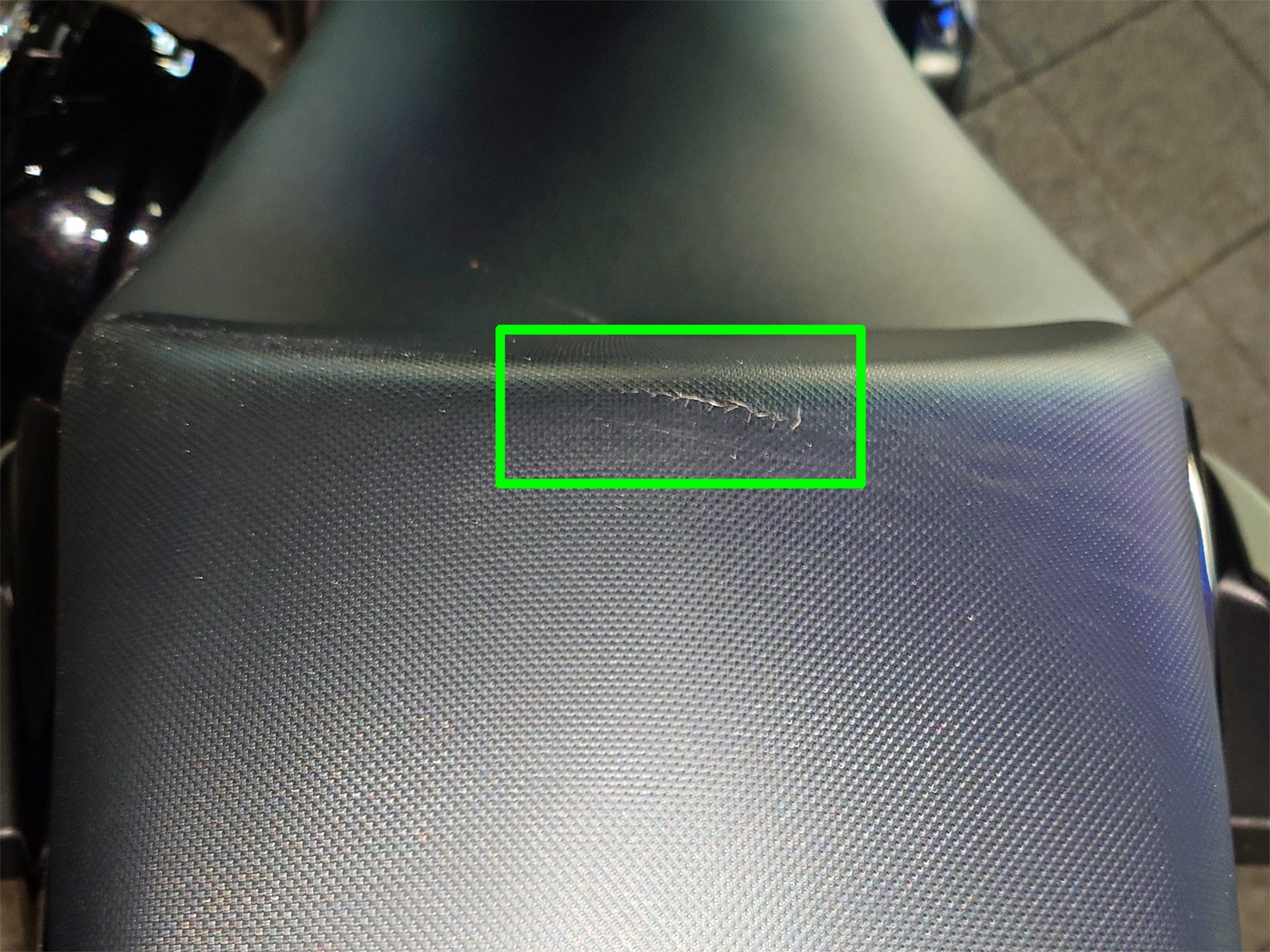 | タンデムシートのひび割れ部分(緑枠内) ひび割れはあまり大きくはないけれどそこそこ目立つ。 |