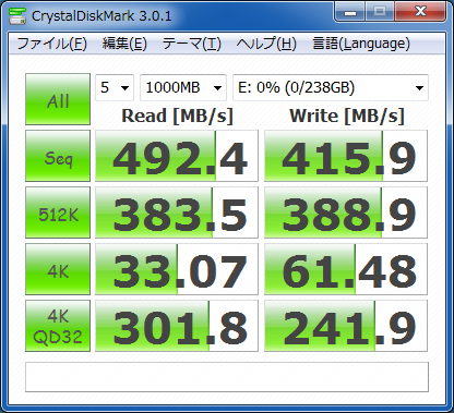 今回のSSD換装に際して、CrystalDiskMarkでベンチマークも行ってみた。テストデータが全て0の場合、SandForceコントローラ採用のVertex3だと圧縮が効いてベンチマーク結果が跳ね上がる。PX-256M3PではMarvellコントローラ採用でデフォルトでも全て0でもさほど結果は変わらない。