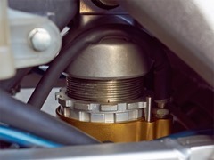 今回のオーバーホールでの最大の目的であるプリロードアジャスタの正常化については、何とか無事に達成できたらしい。以前なら15回転ほど回さないと手応えがなく、最大(26回転)でも少ししか動いてくれなかったプリロードについては、かなりまともに作動するようになった気配。プリロードアジャスタ2回転ほどで手応えが出るようになり、それから26回転まで回すと以前より大幅にプリロードがかかるようになった。また、以前にはなかった油圧ホースの保護チューブ装着も確認。