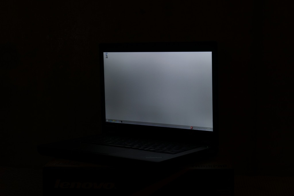 T440pを受け取って初期セットアップを行っていったのだが、ここで、さらに愕然とする状況に気がついた。液晶の表示品質が妙に悪いのである。カタログページには「広い視野角のIPSパネル」との記載があったので、それなりに視野角については期待が持てるものと思っていたのだが、実際に届いたT440pに搭載されていた液晶は、斜めから見ると輝度が落ち、輝度のムラも発生する代物であった。また、画面を正面から見ても、画面の左右で輝度が違って見えるような状況であった。どうやら、T440pの液晶パネルとして採用されている製品には2種類あって、視野角が広い高品質なIPS液晶パネルと、視野角が狭く低品質なIPS液晶パネルが混在していたらしい。で、低品質なパネルが搭載されたT440pがうちに届いた、ということらしい。以下の写真は全て同じ条件で角度だけ変えて撮影したものである。(ピンぼけの写真あり)