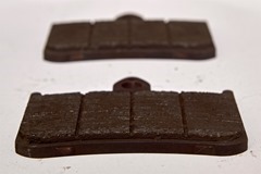 撮影角度が違うので比較しにくいかもしれないけれど、厚さの違いから、減り具合は分かってもらえるかと思う。まだ摩擦面に溝が残っているので、もう少しは使用可能な気配ではある。ちなみに、新品パッドの摩擦面の厚さはだいたい4.3mmあたりであったが、使用済みパッドの摩擦面の厚さは1.5mm~2.5mmというところであった。厚さが違うのは、もしかすると動きが渋いブレーキピストンがどこかにあったためかもしれない。