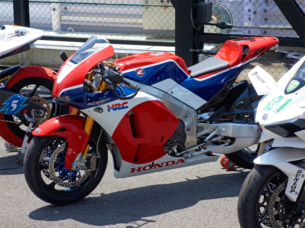 H2Rのデモ走行は、レーサー仕様だけあって爆音でめっちゃ速い印象。RC213V-Sについては、フルパワー状態で無かったらしく、予想していたよりあっさりとした走行で少しがっかり。神電四・韋駄天ZEROについては、電動バイクなのでエンジン音が全く聞こえず、ホームストレート走行時にはほぼ風切り音しか聞こえなかった。これには驚いた。スタンドで見ていた人々も一様に驚きがあったようで、みんな、ホームストレート通過中は静まりかえり、通過後にざわついていた。異次元の感覚とでも言えばいいのだろうか。