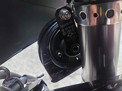 左側ホーンについて十分なクリアランスを確保できたと思い込んでいたのだが、勘違いしていたことに後から気付いて取付位置を修正した。ブレーキをかけた際にたまに異音が発生していたので心配になりホーン周りを確認してみると、左側ホーンとブレーキホース等のガイドが接触する位置になっていることを確認。ガイドパーツはバネ下にあるので上下動することを失念していた。左側ホーンを干渉しない位置にずらすことで対処。記事を修正し、左側ホーン取り付け修正後の写真を追加。